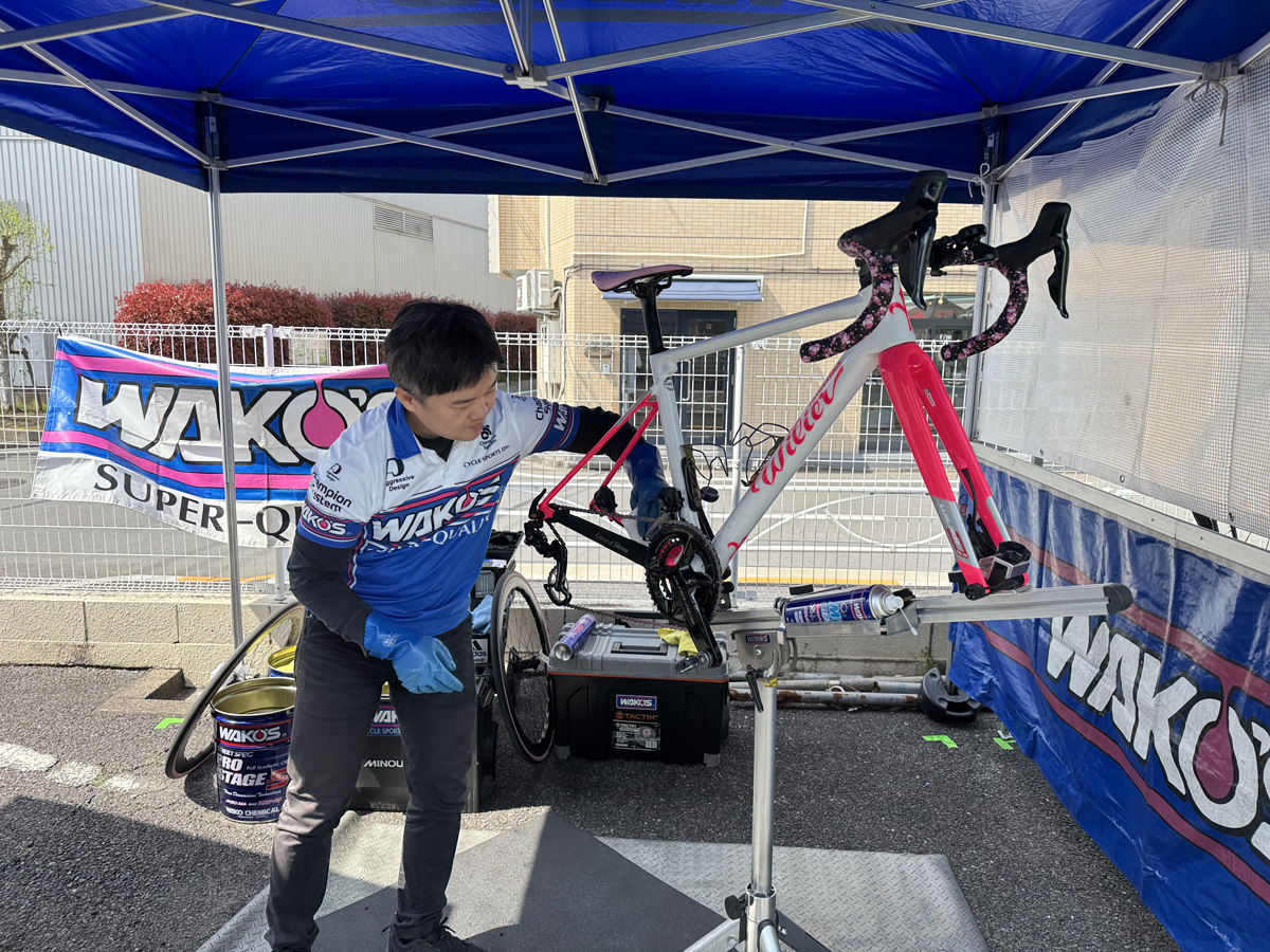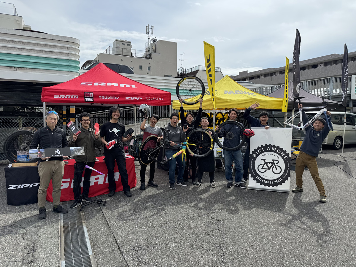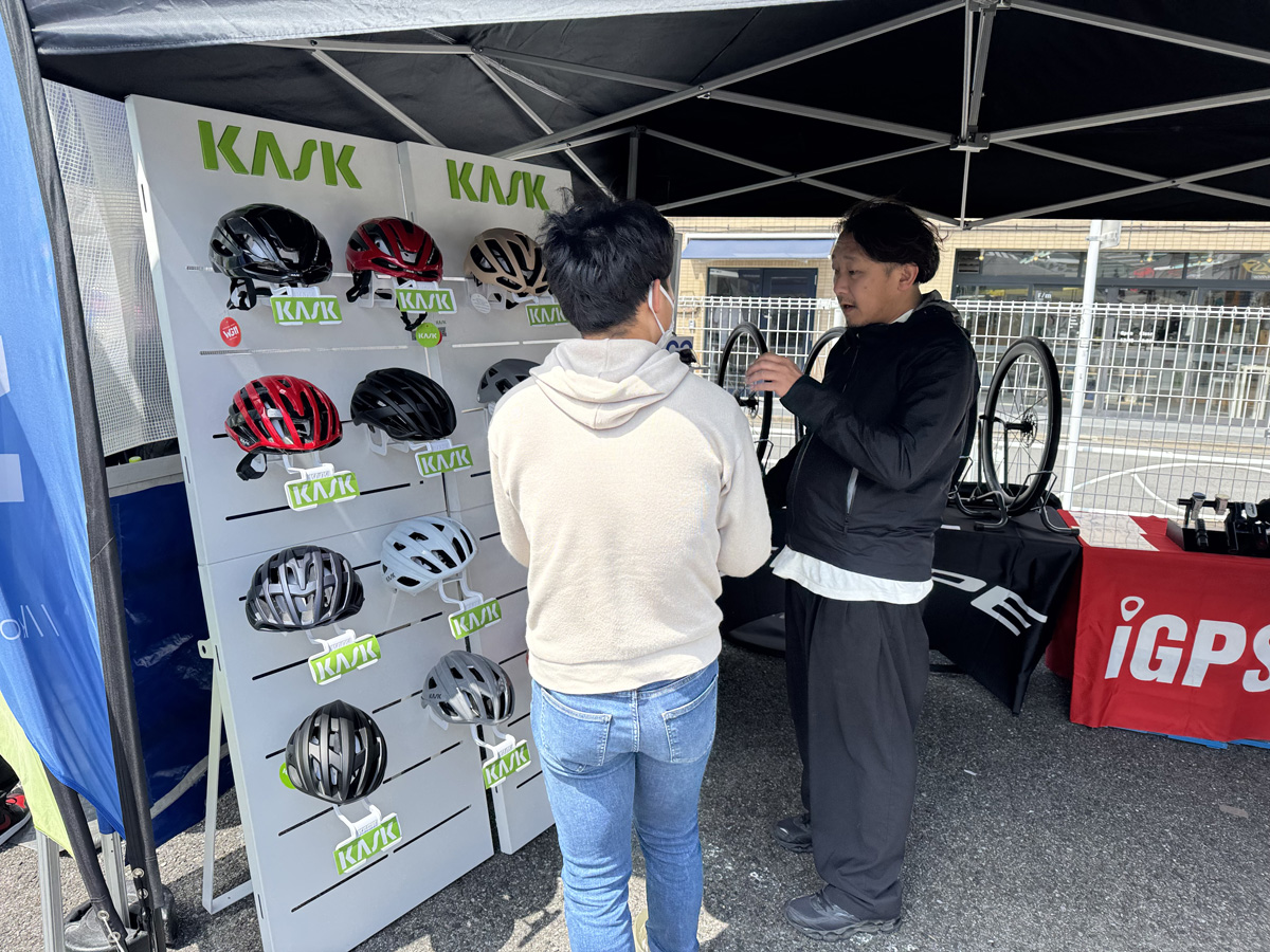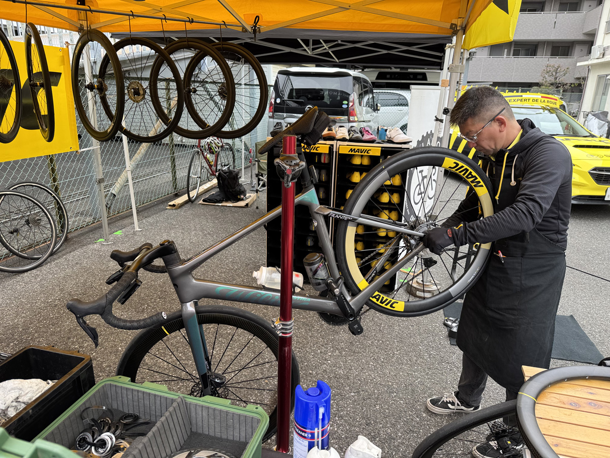 来場されたお客様の中には、ビチアモーレさんで古くなった愛車を下取りに出して、その勢いで新しいウィリエールの新車を買って頂けた方もおられました!ありがたや~!日本人に人気のヘルメットのカスクやリマール、超高級スーパーホイールのスコープやジップの新型にユーザーは興味津々。ワコーズでは丁寧な仕事っぷりが人気で、洗車サービスに予約が殺到。私も愛用しているマビックではメカニックの方がテキパキとディスクローターを取り付け、試乗用ホイールをユーザーの皆様がテストしていました。