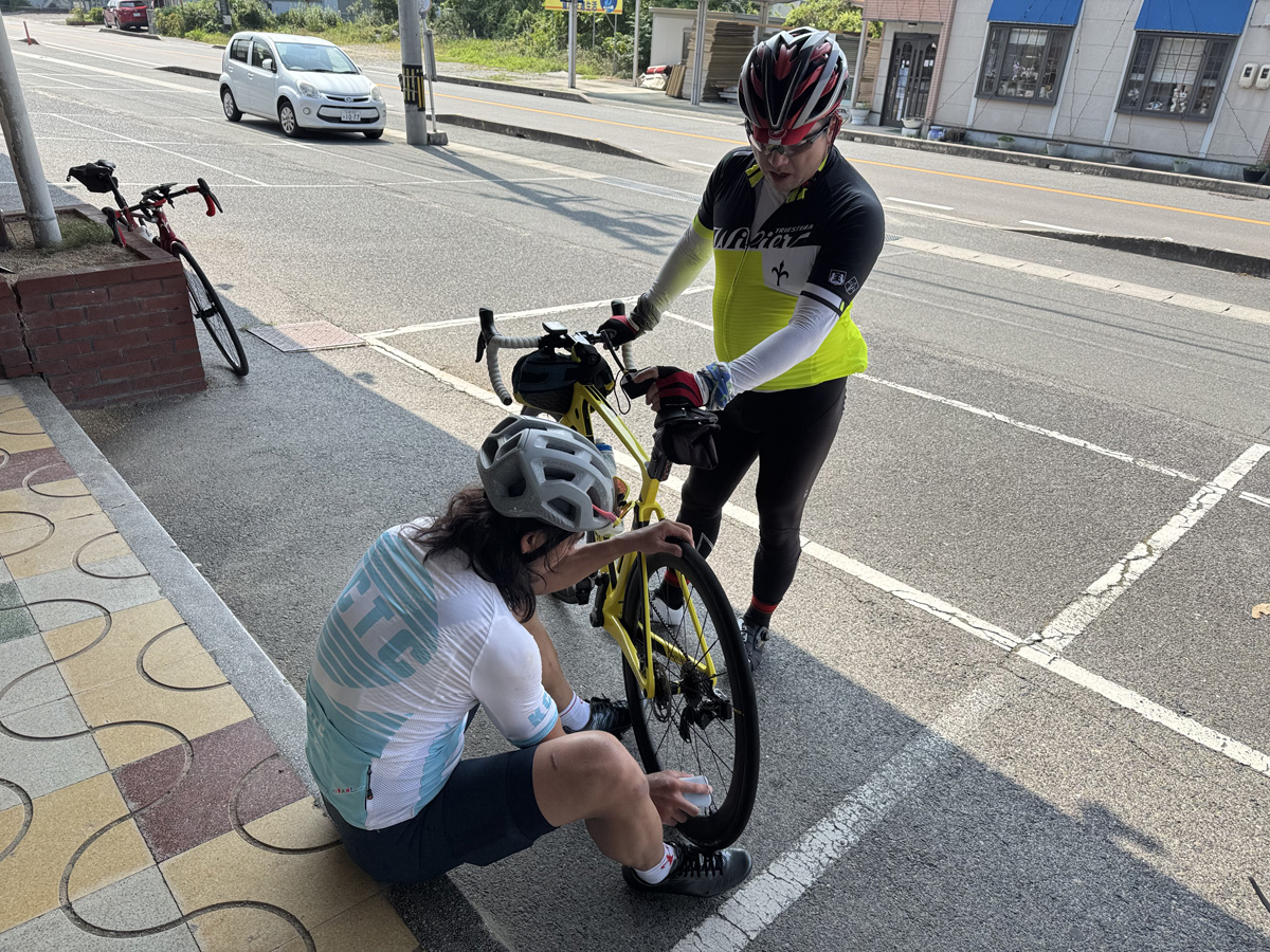 大崎上島の酷道を抜けた所でスローパンク発生、その場でパンク修理開始 photo : Kitto Kitamura