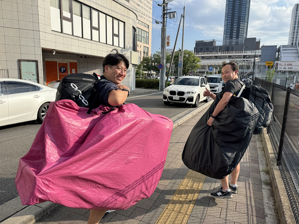 広島駅へ向かう前に輪行袋に自転車を収納、新幹線組は無事に予約した新幹線に間に合った photo : Kitto Kitamura