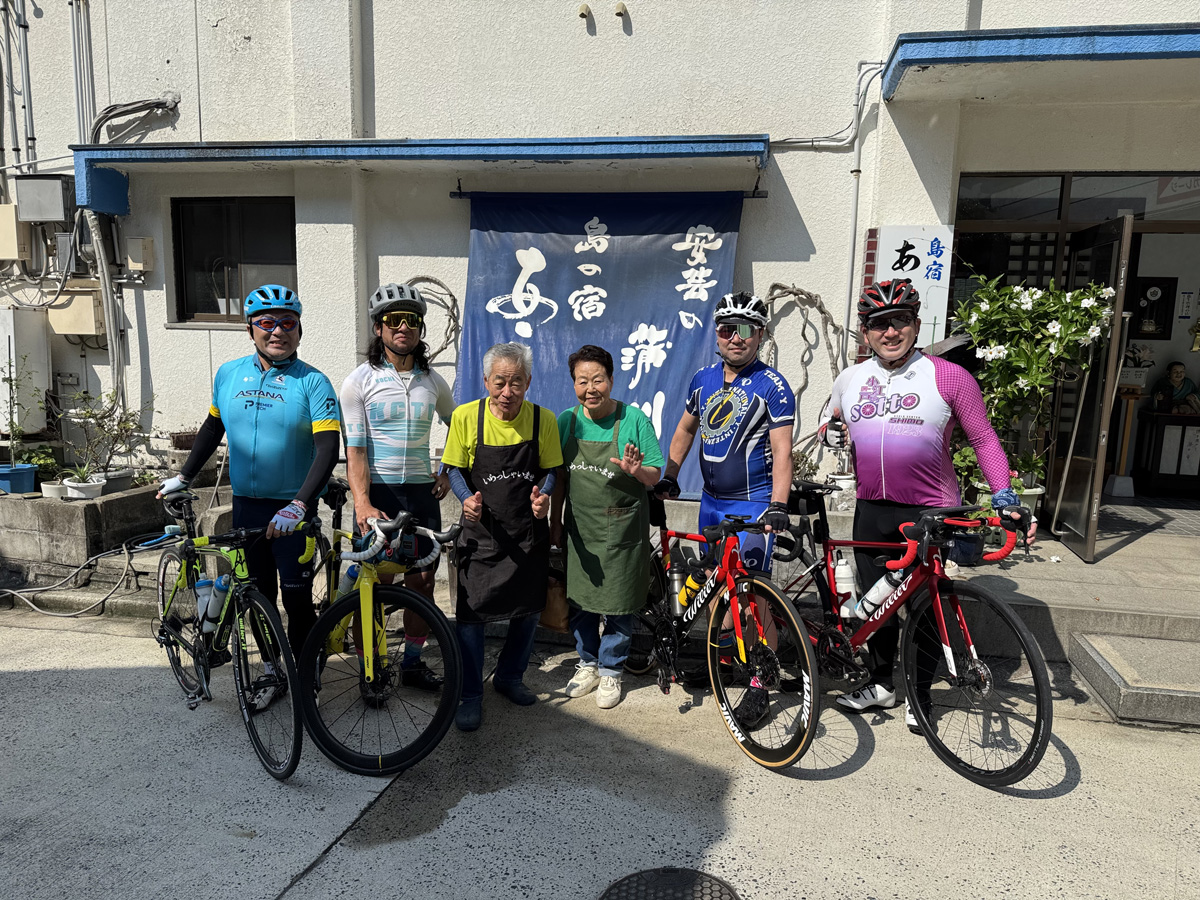 島の宿あこうの御主人と女将さんと記念撮影をしてから、とびしま海道ライドがスタートです。女将さんは声が美空ひばりさんにとても似ている素敵な方でした。女将さんのカラオケ18番も美空ひばりさんだそうで、お宿滞在中は愛を込めて女将さんの事を“ひばりさん”とよんでいました。そんな女将さんが私達の自転車の値段を聞いて腰を抜かしていました。そりゃ、今の高級ロードバイクの値段を聞いたら普通は腰抜かしますよね…。