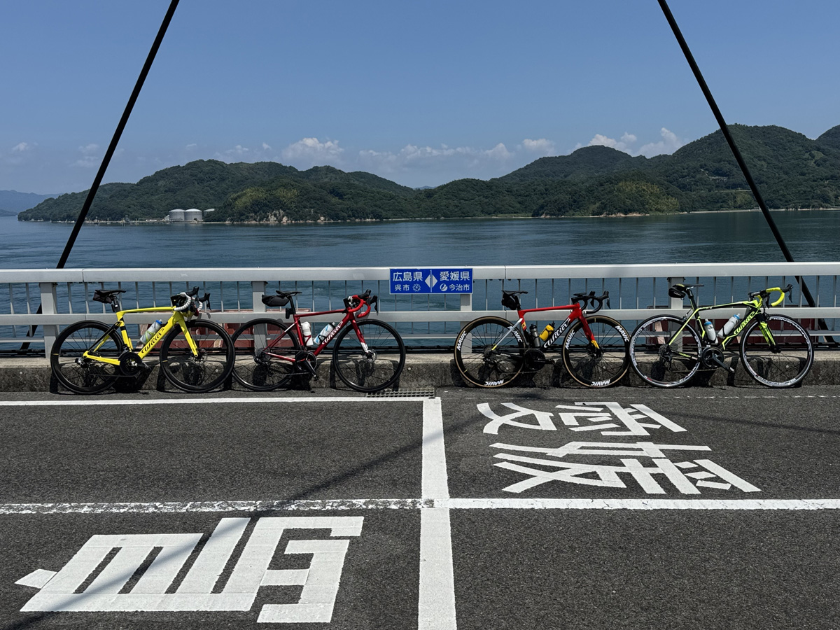 今夏の中年のおっさんの修学旅行イベントは、渡米し『Ride to 獺祭BLUEツアー』でニューヨーク→獺祭BLUE工場までのライドを敢行する予定でした。しかし、為替の悪化と世界情勢の不安定さにより、獺祭ライドツアーメンバー全員のモチベーションが上がらず、今年は『とびしま海道ツアー』へと予定変更になりました。参加メンバーはゼロSLR乗りの“サイクルセンターしも”の下さん、フィランテSLR乗りの“ワイズロード新宿本館”の那須さん。アシスト兼雑用係にはチェント10Proディスク乗りの“サイクリングショップヤマネ”の山根さん、参加者唯一のリムブレーキバイク:チェント1SRの私・キット北村の獺祭ライド古参メンバー4人です。