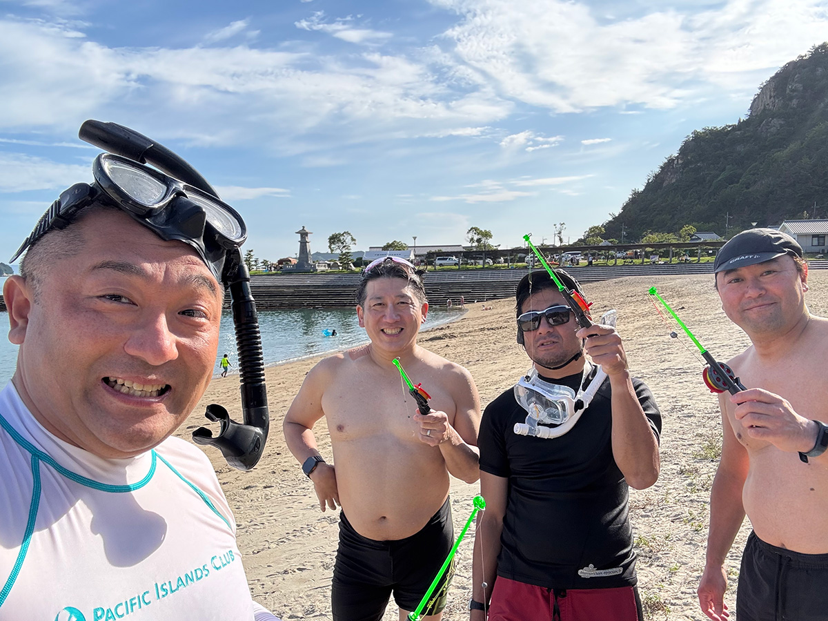 お昼御飯を食べ終えると、映画:海猿のロケ地である県民の浜でシュノーケルフィッシング大会です。行きつけのスキューバダイビングショップでシュノーケル用の釣竿を入手し、皆で釣りをしました。ちょっと瀬戸内海の魚には釣針が大きかったのか?餌をつついている感触はあれど、全く釣れませんでした。釣りバカとして大変残念です。