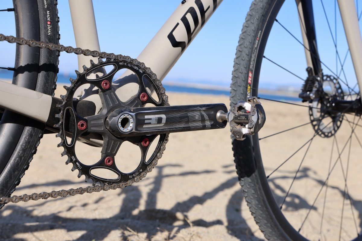 クランクはローター 3Dクランクで、取り付けていたフロントシングル用のチェーンリングは44Tと重めのセッティング。対してリアのカセットスプロケットはワイドレシオの11-32Tを使用していた。