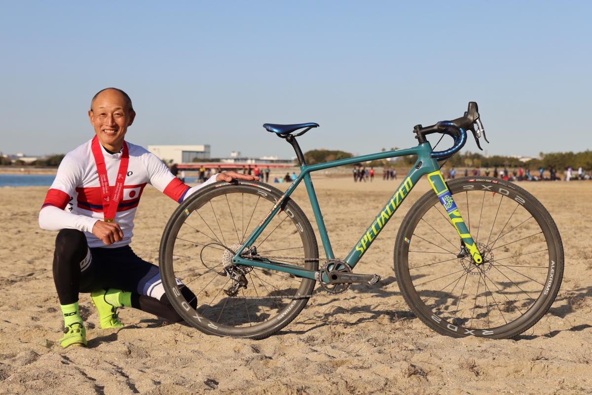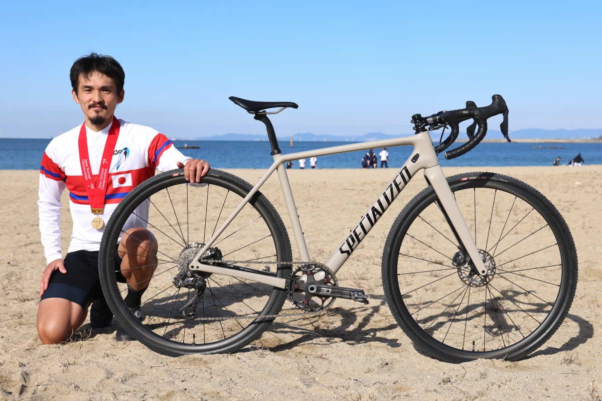 最終周回に先行する2名を抜き去り、男子35-39のチャンピオンに輝いた和田拓海さん。愛車は背景の砂とマッチするサンドカラーのスペシャライズド CRUX。コンポーネントはシマノ GRXの11速モデルで、ブレーキキャリパーはフロントがDURA-ACEとリアがGRXをミックスして搭載。ペダルはシマノ XTを使用していた。