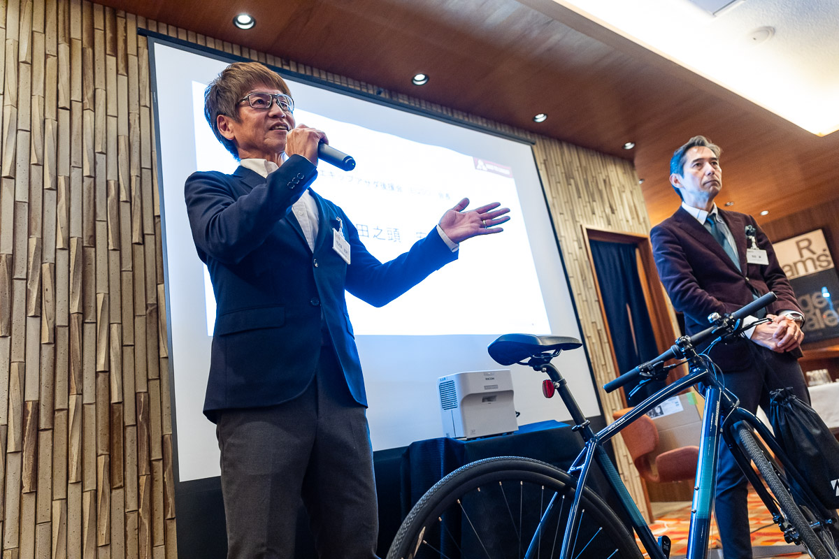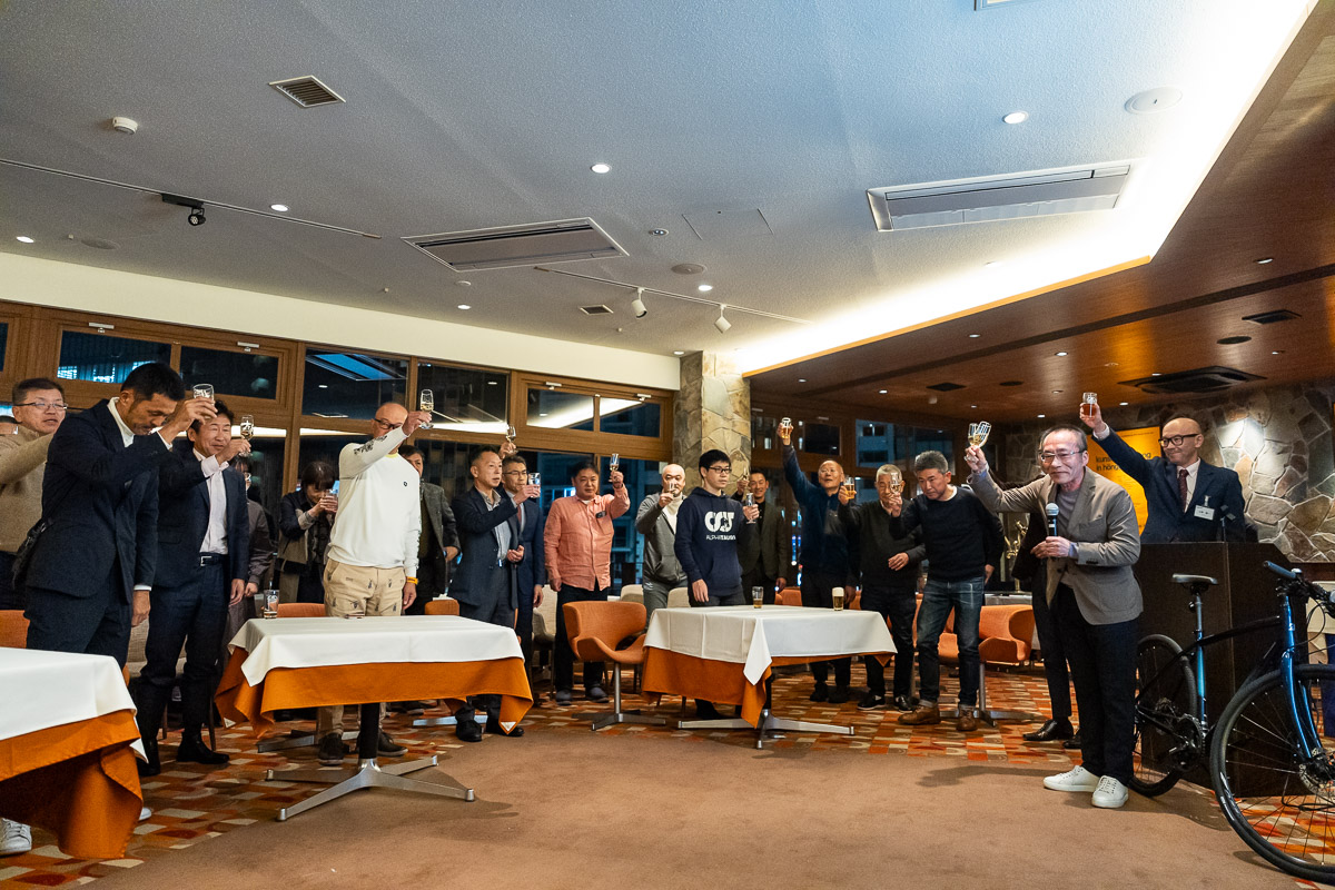 最後は主催のエキップアサダ後援会の会長・田之頭宏明氏が挨拶。「皆さん、ツール・ド・フランスで走る日本人をもう一度見たくはありませんか!?」と熱いメッセージを贈り、会場の気持ちを一つにする場面も。それを受けた浅田顕氏が、来場者や全国の支援者に謝辞を述べ、会は閉幕した。