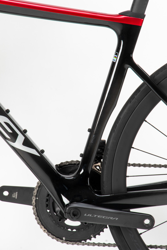 更に、ジオメトリー面ではトッププロたちから集めた意見を反映し、よりレーシングなスペックに。短いヘッドチューブと低重心となるよう拡大したBB下り、低めのスタック、長いリーチ設計によってアグレッシブな前傾姿勢を取れるようになっている。一方で、チェーンステーを長めにすることでスタビリティを確保し、荒れたパヴェや下りでも攻められる安定感を確保した。