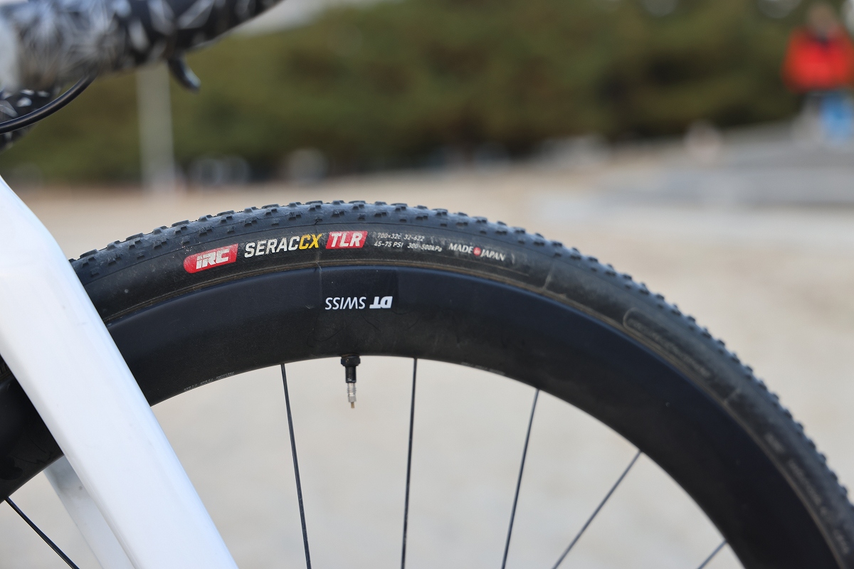 ロヴァール Rapide C38のホイールに、タイヤはiRC SERAC CXシリーズを愛用。「普段はiRC SERAC CXばかり使っています。今回は砂が多いコースだったので普段は使わないEDGEを使ったのですが、直線も速く、曲がりやすくて良かったですね」と。体重は48kgで、空気圧は1.33barで運用していた。