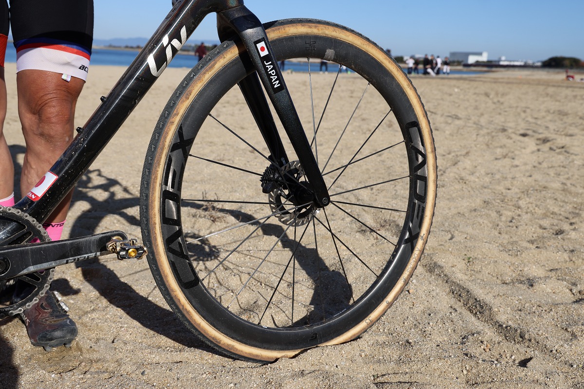 「ホイールはロードレースで使っていたカデックスのチューブラーホイールを今回の全日本から使っています」と語る増田さん。タイヤは砂のコースに合わせ、ヴィットリア デュガス Pipisqualloを選択していた。空気圧については、「砂は1.2barで良かったのですが、松林区間では腰が砕けてしまいました。空気圧を攻めすぎましたね」と振り返った。
