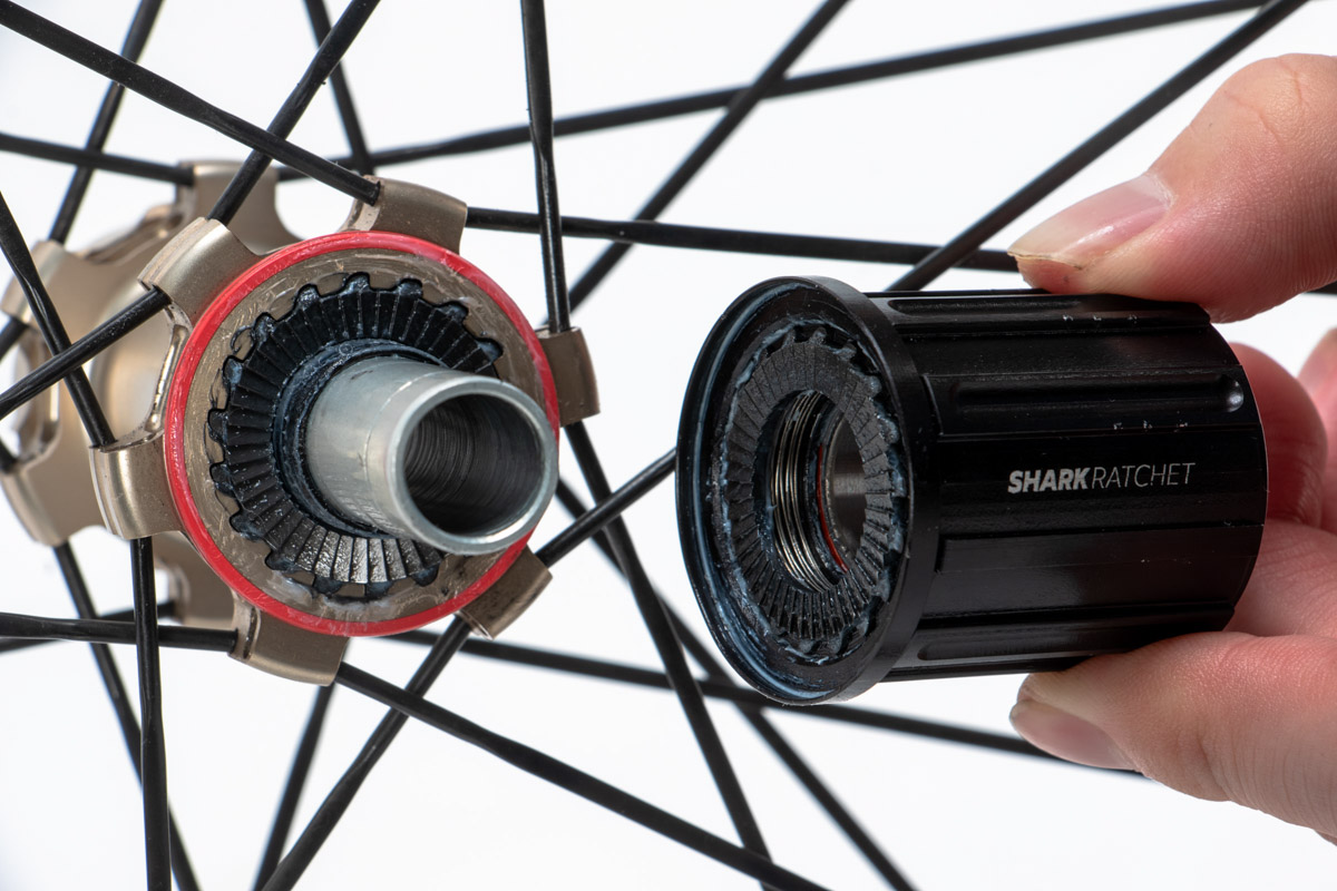 Q10ハブの核となるのがSHARKRATCHET機構だ。45歯構成で8°エンゲージメントを実現する面ラチェット方式により、素早い嵌合を可能にしている。スプリントや急勾配での立ち上がり時に即座に反応してくれることが大きな魅力だ。ギアにはセラミック加工が施され、耐久性向上と抵抗低減を図る。またCrest-to-Crestと名付けられたスプリングを搭載することで、耐久性やパフォーマンスを高めている。
