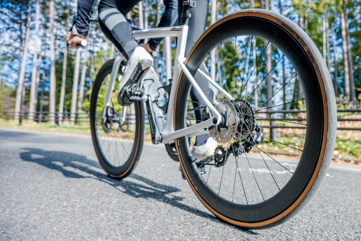 一方、エンデュランスモデルらしくトレッドの厚みがあるおかげかクッション性も良好。荒れた路面でも振動が伝わりづらく、とにかく楽に走っていけるので自然と距離が伸びていくタイヤだ。