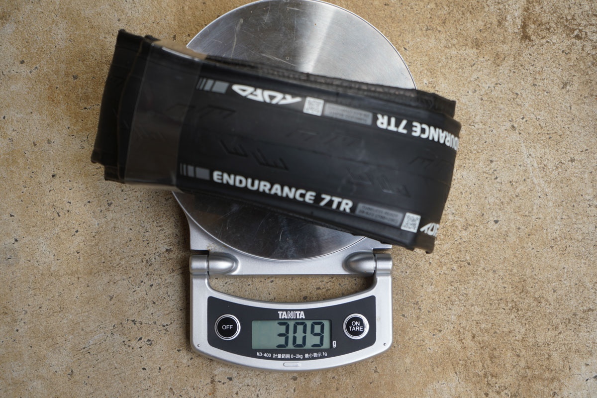 その気密性の高さやエンデュランスタイヤらしいトレッドの厚さも相まって重量自体は実測で309gと少し嵩むものの、実際の走りはかなり軽め。トラックタイヤでも定評のあるTUFOらしい転がりはこのタイヤにも受け継がれている。