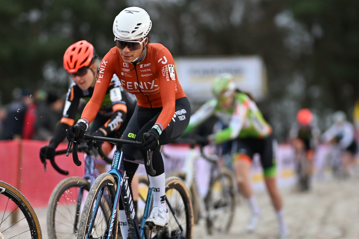 71名がエントリーした女子エリートレースに連戦連勝中のルシンダ・ブラント(オランダ、バロワーズ・フェルゼクリンゲン・ヘットプーツブーロー・ライオンズ)やプック・ピーテルセ(オランダ、フェニックス・ドゥクーニンク)の姿は無し。チャンスを掴むべく、今季まだ勝利の無いセイリン・アルバラード(オランダ、フェニックス・プレミアテック)が積極的な走りでリードを奪った。
