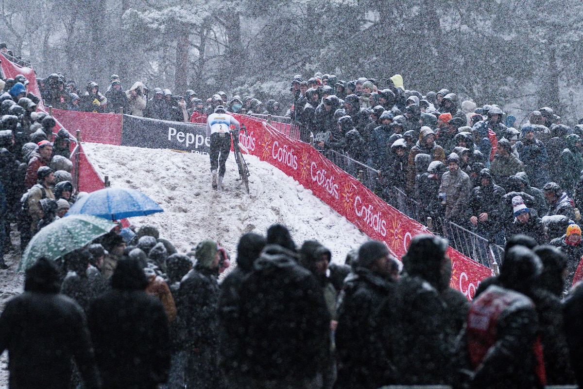ファンアールトも、凍てつく吹雪も、マチュー・ファンデルプール(オランダ、アルペシン・プレミアテック)を止めることはできなかった。ファンアールトは7周に渡って世界チャンピオンに挑んだものの、激しいクラッシュで落車リタイア。ファンデルプールが今季負けなしの8連勝をマークした。