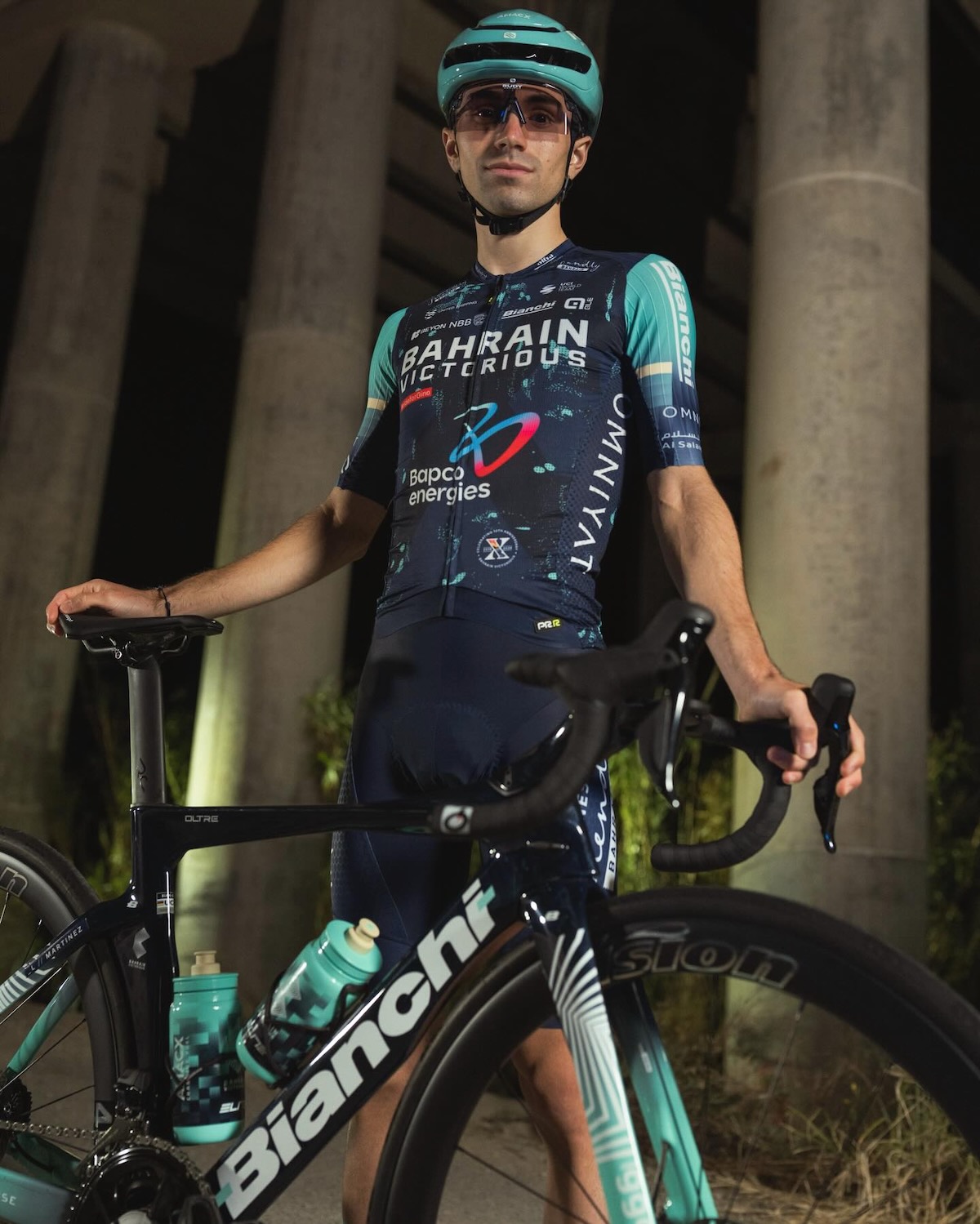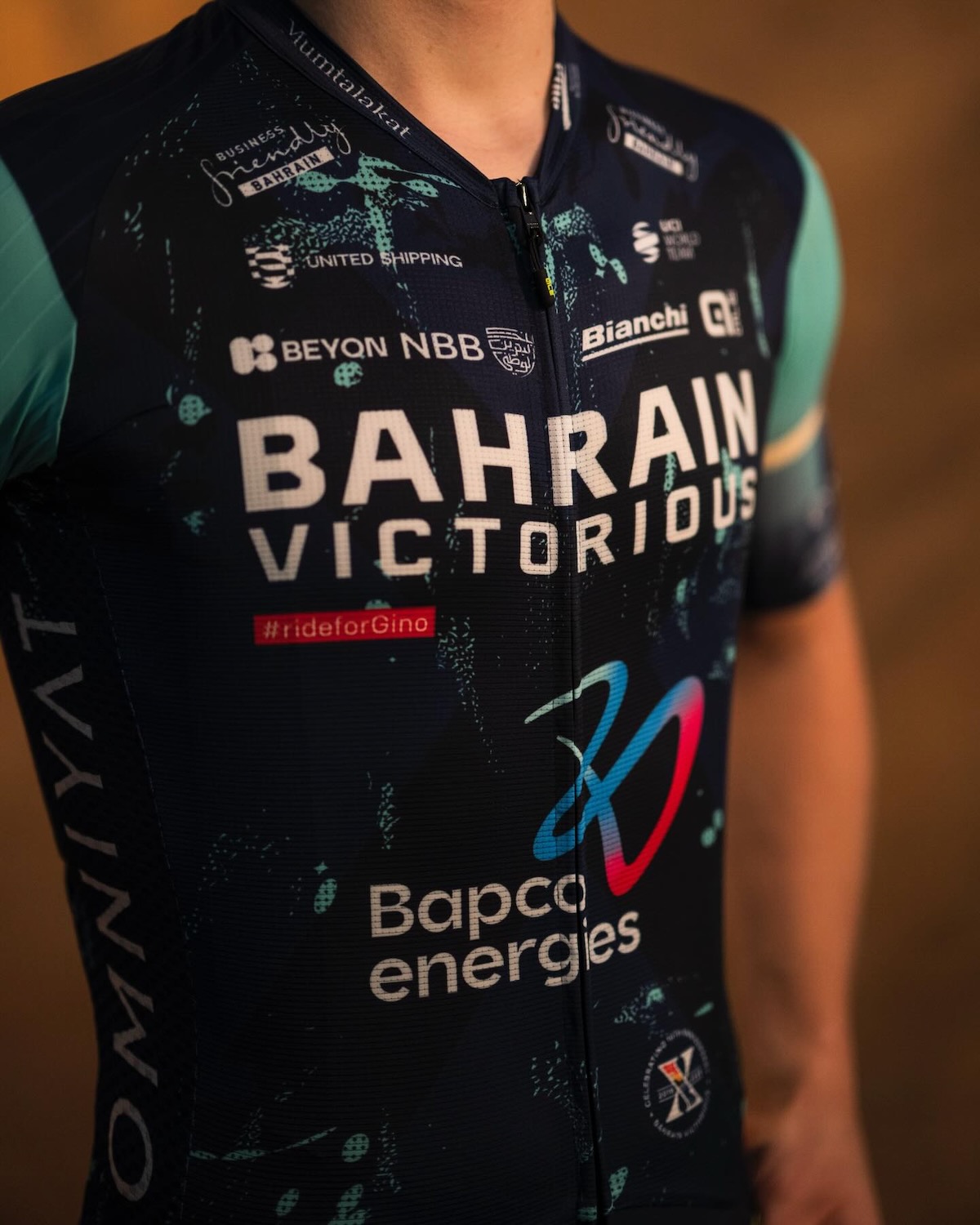 両袖に入ったのは、バーレーンの「二つの海」やディルムン文明からインスピレーションを受けたというチェレステだ。もちろん、長らく使用バイクだったメリダが離れ、新しく迎え入れたイタリアのバイクブランド、ビアンキを象徴する色。また、ジャージの袖とサイドには、新たなスポンサーとなったドバイの不動産企業であるOMNIYAT(オムニヤット)のロゴが入り、また2016年に創立され、今年で10周年を迎えることからジャージ全体に薄く、そしてシンボルとして10を表す「X」の文字が入っている。