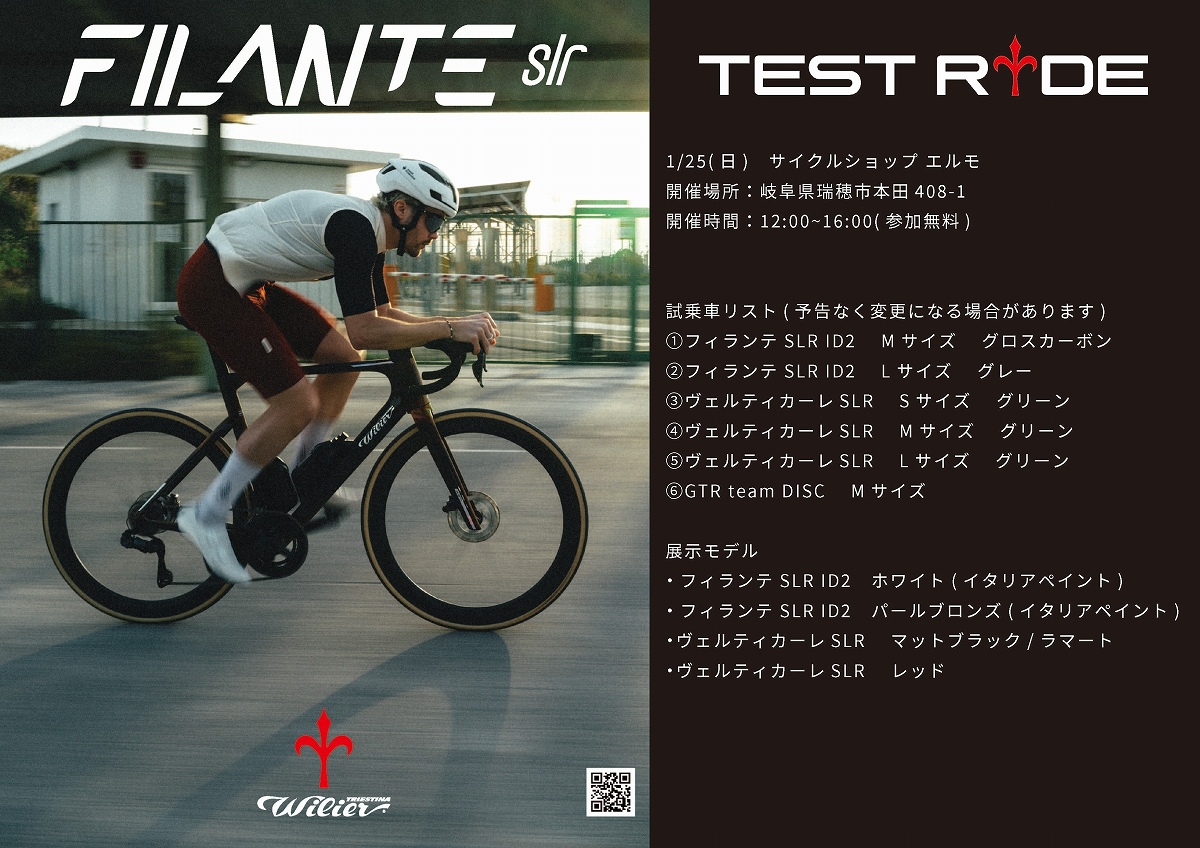 ウィリエールが1月25日(日)に岐阜県瑞穂市のショップ「サイクルショップ エルモ」で試乗会を開催する。最新モデルのFILANTE SLR ID2などの最新ラインアップを試乗できる機会だ。以下、プレスリリースより紹介しよう。