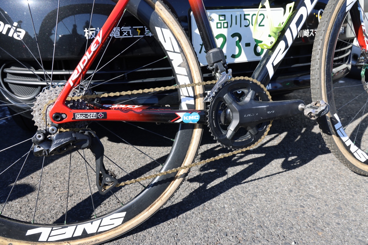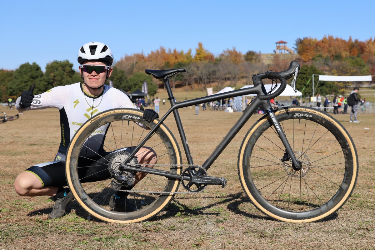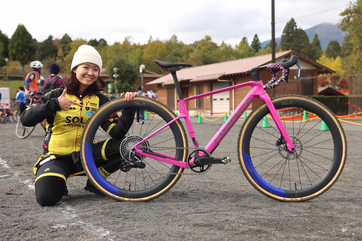 「フレームがピンクなので、コントラストとしてホイールは青にしています」と言うホイールも「MyO」でカスタムされたオークォのRP50LTD。タイヤはヴィットリア デュガス TYPHOONのチューブレスモデルを合わせている。「実はタイヤインサートも入っています。今日は低圧にしていたので、根っことかがでリム打ちしないか心配だったんですけど全く問題なく、むしろ走りやすかったです!」とのこと。御殿場シクロクロスのWE2+3では2位でフィニッシュし、見事表彰台に上がっていた。