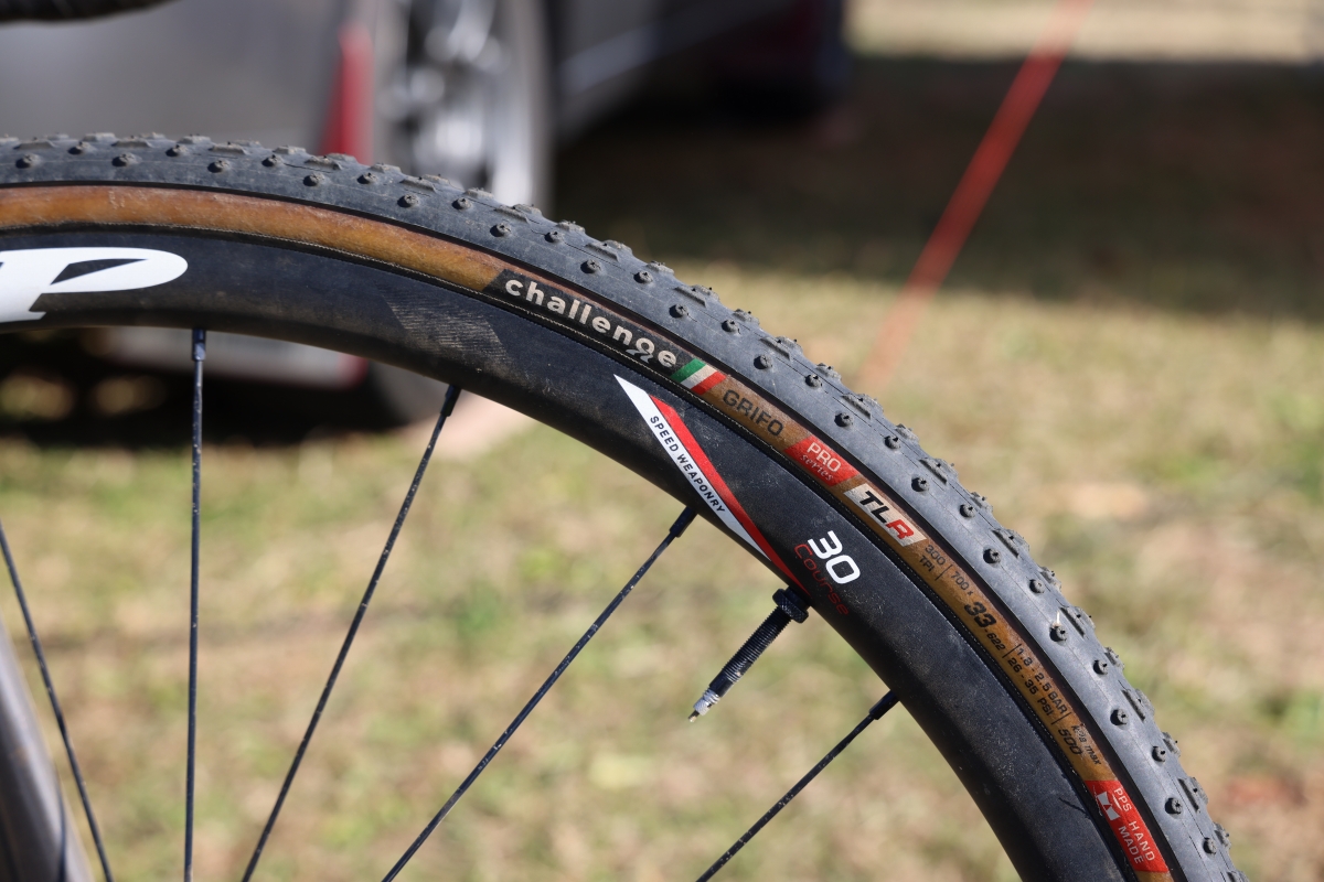 ホイールはジップ 30 COURSE。タイヤは前後で異なり、前輪にはチャレンジ GRIFO、後ろは同じくチャレンジ CHICANEのチューブレスレディタイヤとこだわりのセレクト。さらに、SNSでも最近よく見かける話題のハブ毛を装着。シクロクロスでは砂埃でハブが汚れてしまうが、掃除しながら走れると一石二鳥の代物だ。