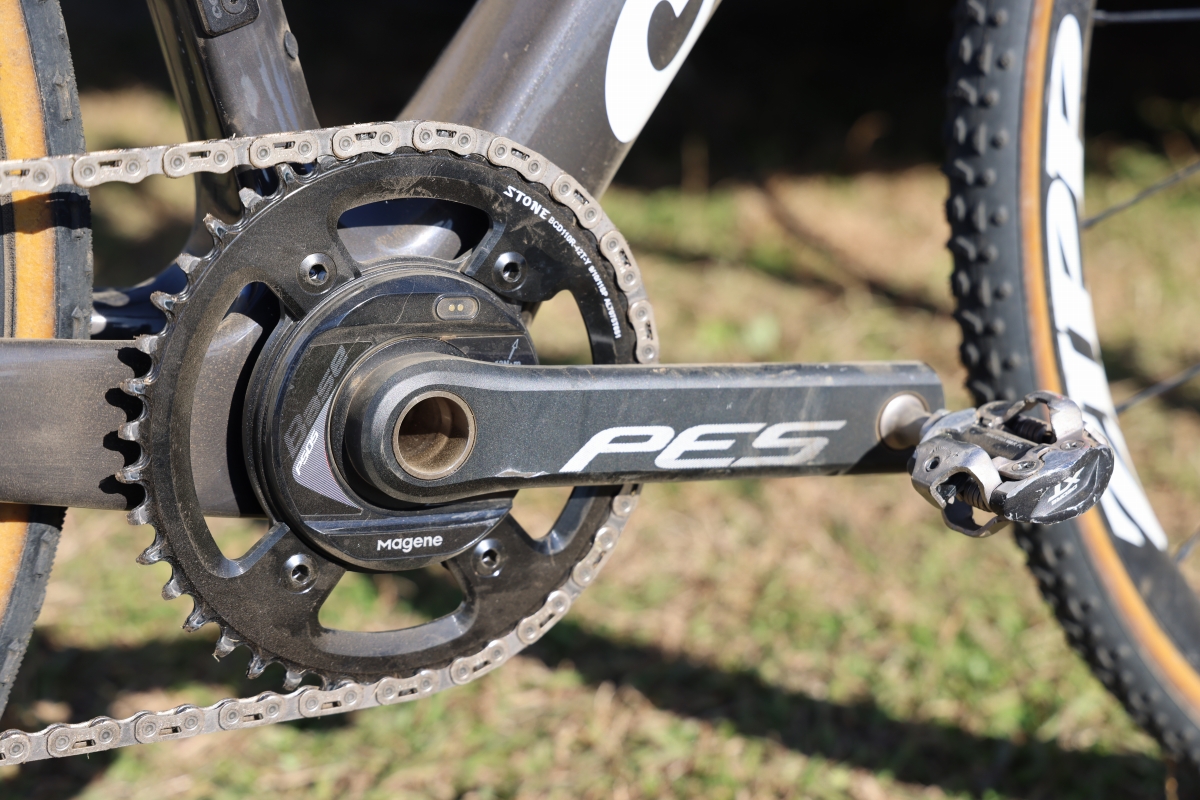 コンポーネントは新型のスラム RIVALで、クランクはマージーンのスパイダー型パワーメーター PES-P505。フロントシングルスピード仕様でSTONEのチェーンリングの42Tを装着し、リアのカセットスプロケットは10-42Tを選択していた。