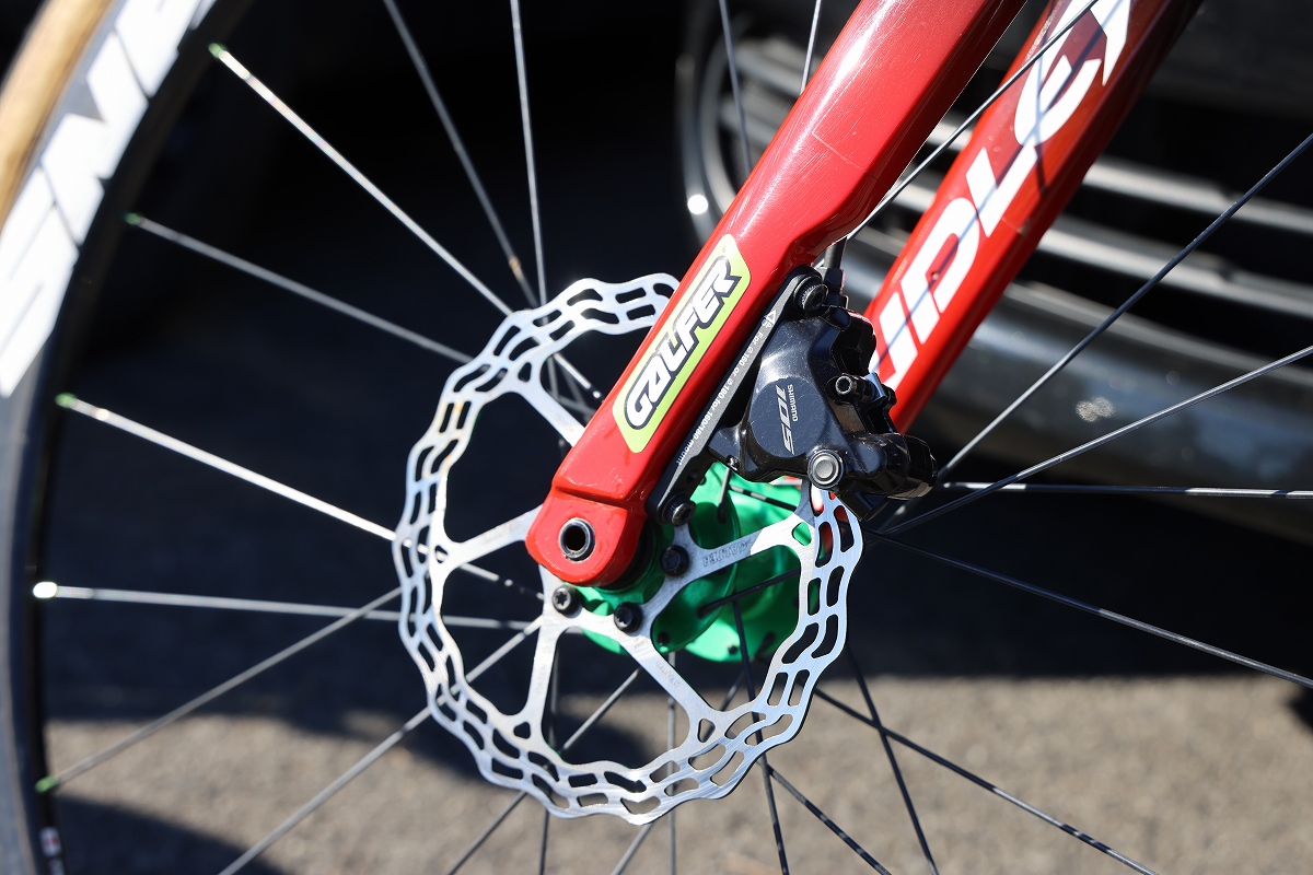 ハンドル周りはリッチーのカーボンハンドルとスペシャライズド S-WORKSステムの組み合わせ。サドルはスペシャライズド Power Arc。ホイールはZIPP 303Sで、ヴィットリア デュガス SMALL BIRDが装着されていた。「かなりグリップしますね。オールラウンドに使えて、芝のコースで走りやすくて気にっています」とメカニックらしいこだわりを語ってくれた。