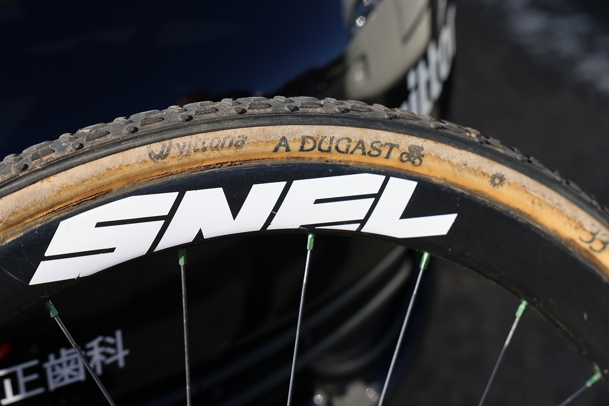 ホイールはSNELのショップオリジナルで、TUNEのカーボンリムとハブが組み合わされたチューブラーホイール。タイヤはヴィットリア デュガス TYPHOONのチューブラーモデルが取り付けられていた。