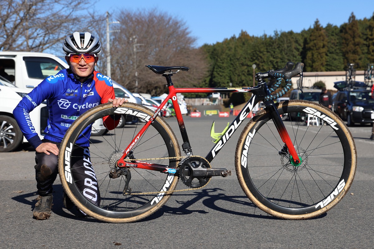 国内最高峰カテゴリーのME1に参戦する田島綾人さん(W.V.OTA)。愛車はリドレーのシクロクロスバイク「X-NIGHT」。バイクは東京都大田区のショップ「バイクショップ スネル」の諏訪さんが組み上げ、メンテナンスされているという。