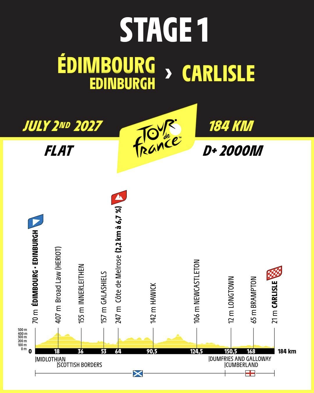 開幕2日前の6月30日にエディンバラ城でチームプレゼンテーションを終えた選手たちは、イングランドのカーライルを目指して184kmを南下する。途中に登場する山岳は登坂距離2.2km、平均勾配6.7%の丘が1つだけだが、コース前半は起伏に富んだレイアウトとなっている。しかし終盤、イングランドに入ってからはフラットな区間が続くため、初日にマイヨジョーヌを着用するのはスプリンターとなる可能性が高い。