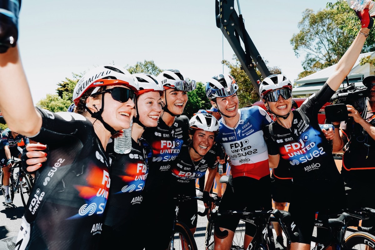 アリー・ウォラストン(ニュージーランド)と共に勝利を喜ぶFDJユナイテッド・スエズ photo:FDJ United - SUEZ