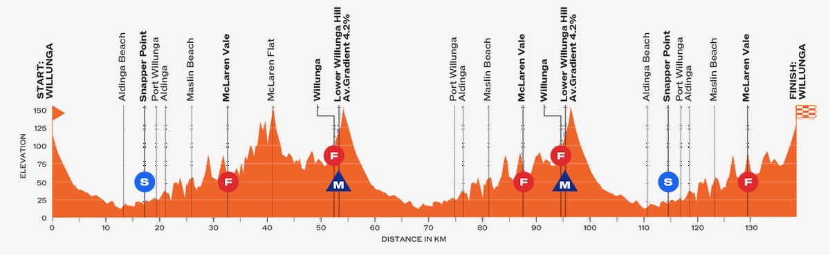 初日はウィランガの周回コースを巡る、大会史上最長距離の137.4km。コースには3度「ローワー・ウィランガヒル」(平均4.2%)が登場し、3度目の頂上がフィニッシュ地点となる丘陵ステージとなった。世界王者のマグドレーヌ・ヴァリエール(カナダ、EFエデュケーション・オートリー)を含む87名が出場し、真夏のオーストラリアを走り出す。残り100km地点でアレッシア・ヴィジリア(イタリア、ウノエックス・モビリティ)が単独で飛び出した。