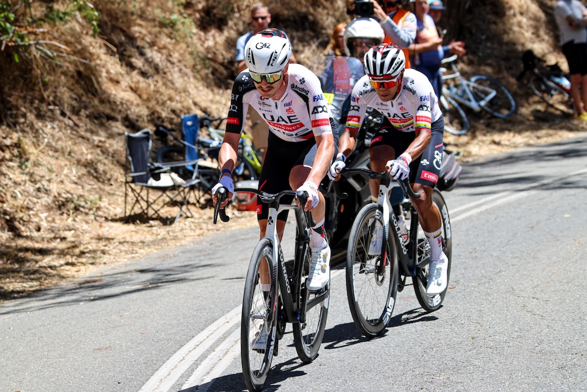 それを追うプロトンは、前回王者であるジョナタン・ナルバエス(エクアドル)を擁するUAEチームエミレーツXRGを中心に牽引する。UAEは今大会、2023年覇者ジェイ・ヴァイン(オーストラリア)やアダム・イェーツ(イギリス)など強力なメンバーを揃え、徐々に逃げとの距離を縮めていく。最後のコークスクリューを前に逃げ集団はバラけ、フラン・ミホリェヴィッチ(クロアチア、バーレーン・ヴィクトリアス)が最後まで抗った。