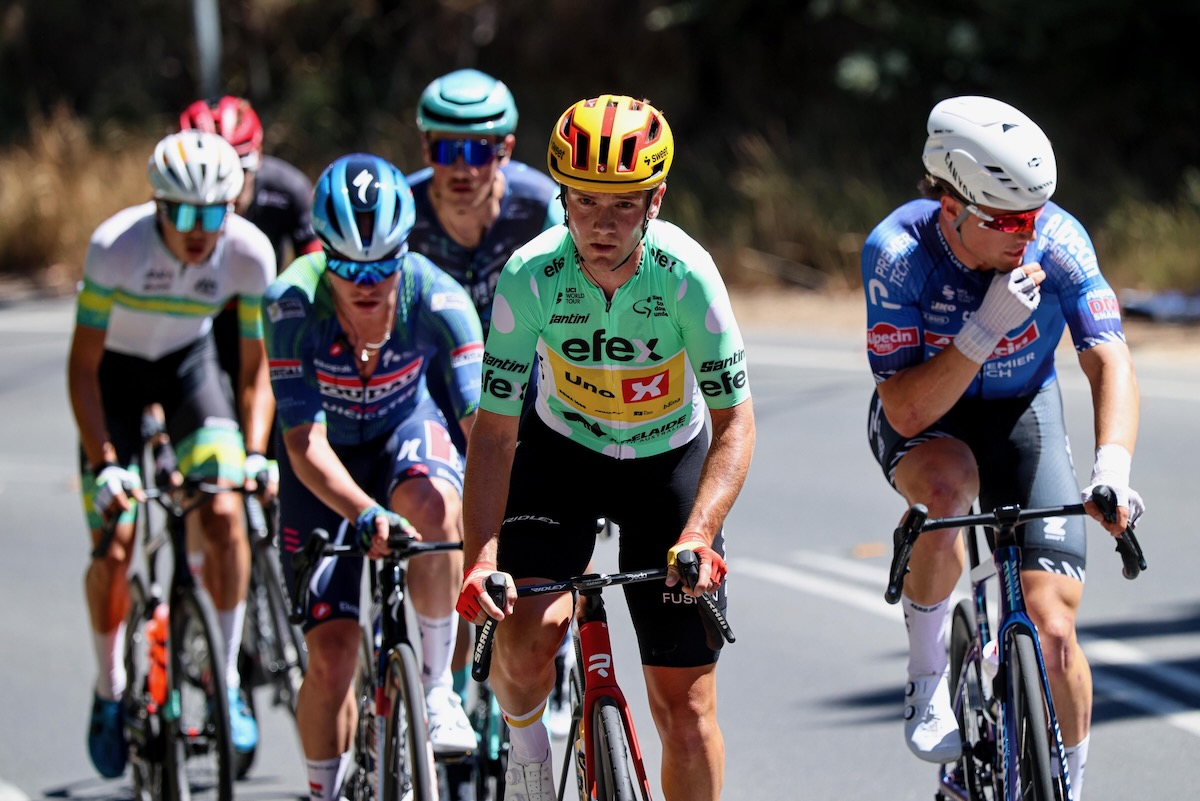 148.1kmという比較的短いステージは、ジョエル・ズーター(スイス、チューダープロサイクリング)のアタックから幕を開け、そこにイェンセン・プロウライト(オーストラリア、アルペシン・プレミアテック)が反応した。プロウライトは1月9日にクリテリウム国内選手権を制した新王者で、2名はメイン集団から続々と選手たちの合流を許す。結果的に7名となった逃げグループは、2分のリードで1度目のコークスクリューを通過した。