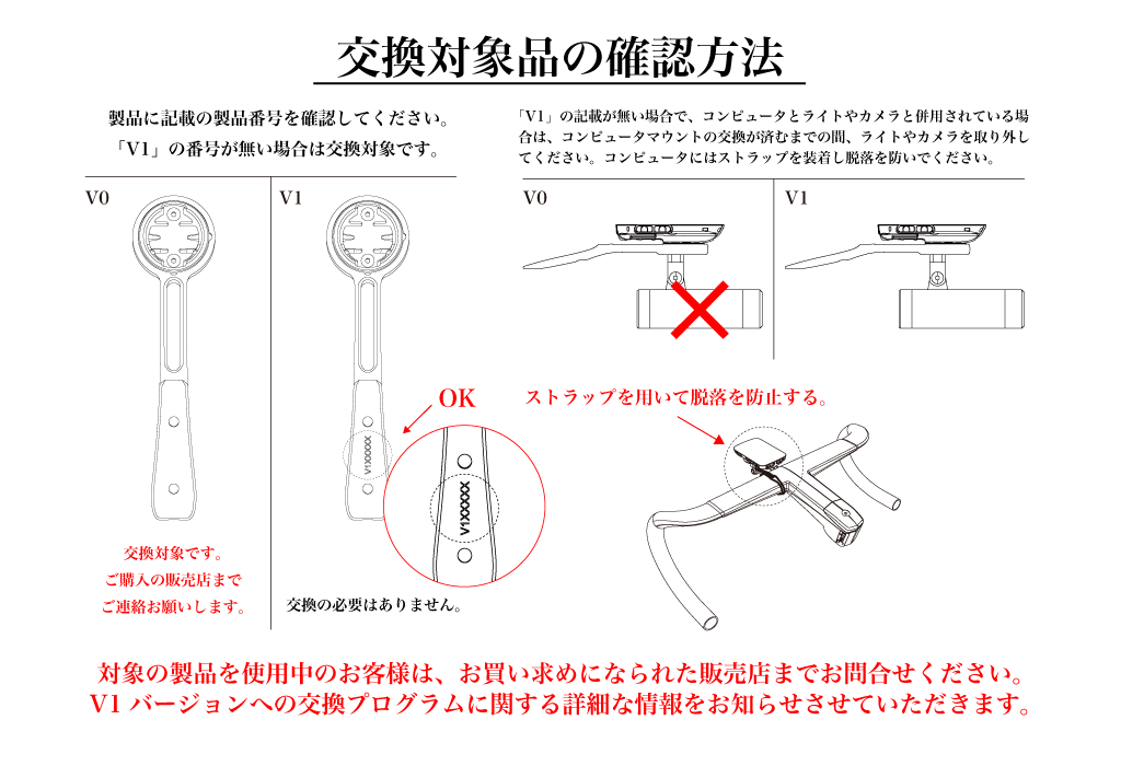 「V1」マークが表示されていないコンピュータマウントをご利用のお客様は、直ちにコンピュータ(ガーミン、ワフーなど)とライトやカメラを併用する使用を中止してください。併用によりコンピュータマウントが破損し、取り付けられた機器に損傷を与える可能性があります。