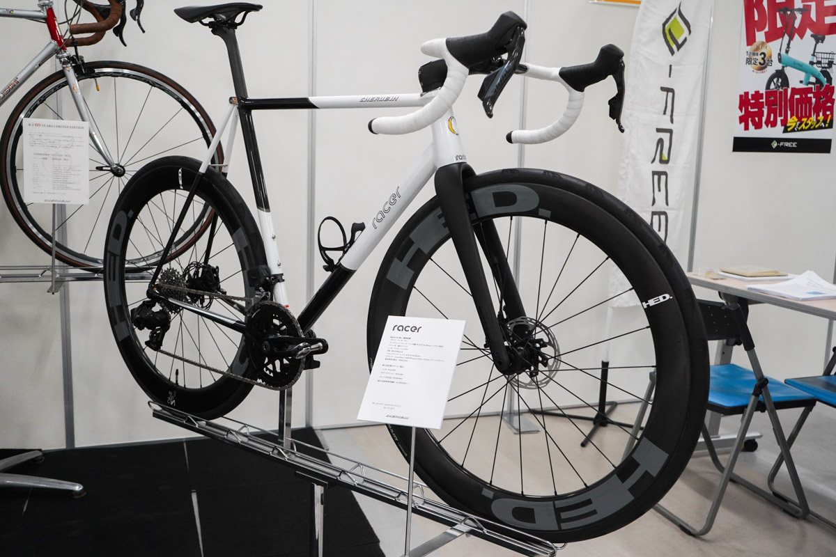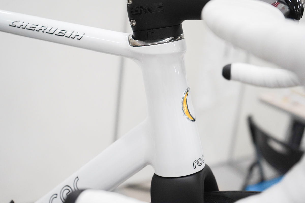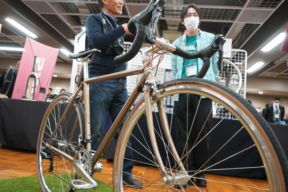 国内外から高い評価を得ているケルビムも会場に実車を用意していた。なかでも印象的だったのが、Racerというスチールバイクだ。近年のトレンドであるケーブルフル内装に対応し、エンヴィのハンドルとステム、フォーク、そしてエアロ感を醸すトップキャップがアセンブルされている。リアエンドはスラムのUDH規格に合わせて製作されており、伝統的なスチールフレームと最新トレンドの見事な融合を見せていた。