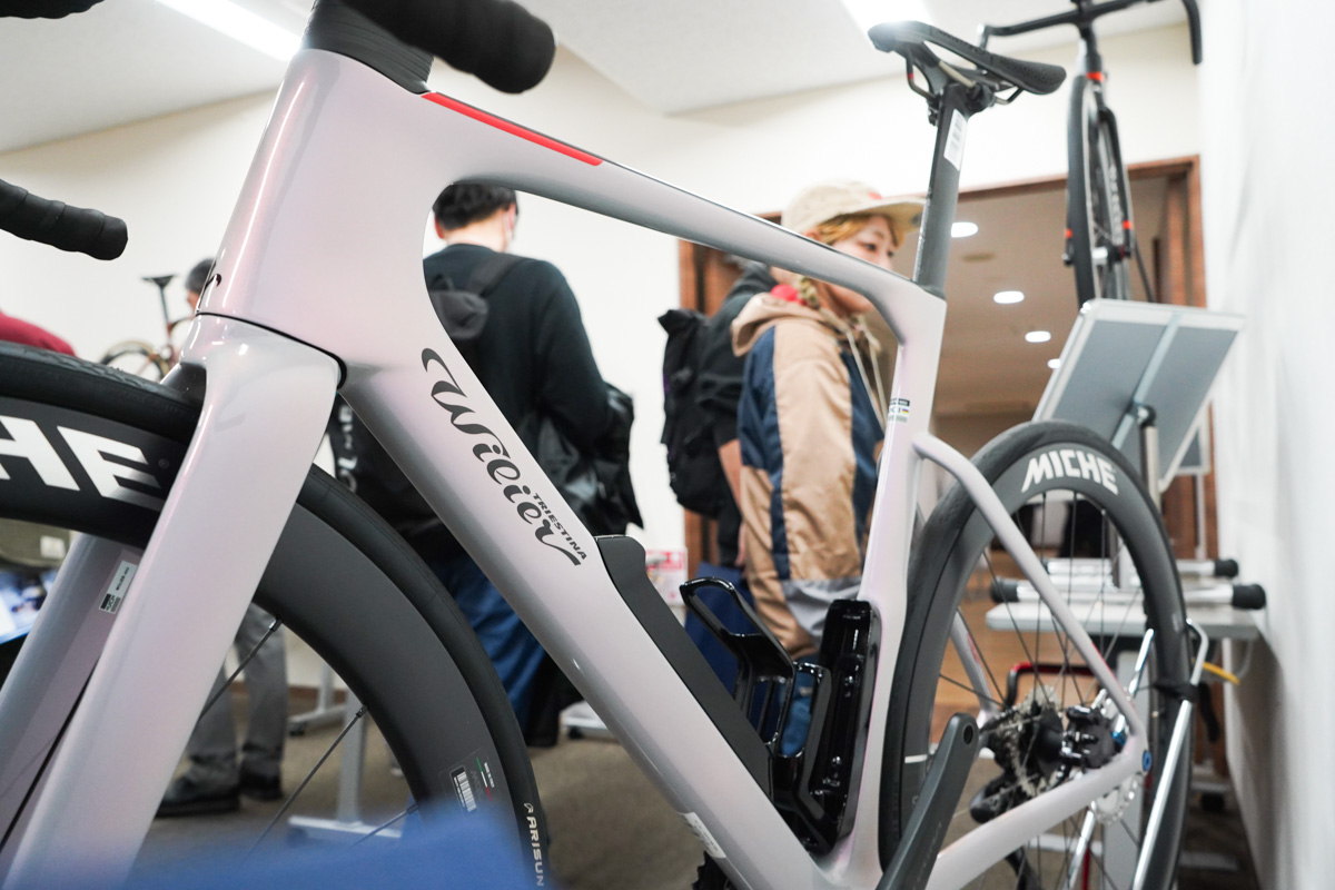 近年のエアロロードは、ヘッドチューブやシートポスト&チューブが極めて薄型化している。実物を目の当たりにすると、その大胆な設計思想がよく伝わってくる。来場者はボトルケージの位置や専用ボトル装着時のエアロフォルムなど、新型FILANTEの細部を熱心にチェックしていた。ブースには、ウィリエール傘下となったミケのカーボンチェーンリングも並び、金属加工技術とカーボンプレートによるエアロ効果を融合させた新型チェーンリングに視線が集まっていた。