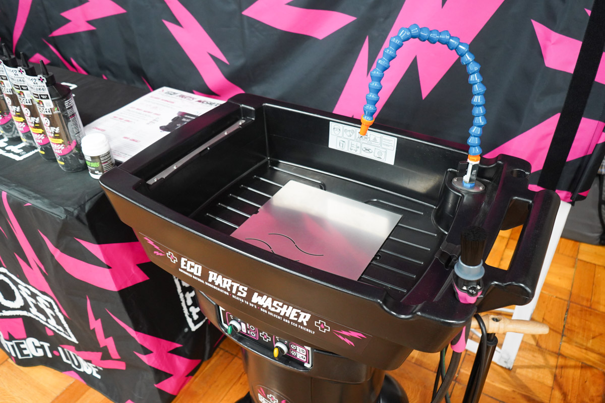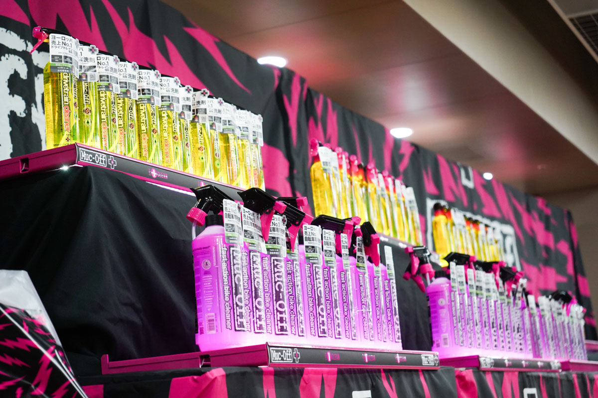 今年もダイアテックが大きなブースを構えて来場者を迎えた。ショッキングピンクのブランドバナーと、ズラリと並べられたNanoTech CleanerとDRIVETRAIN CLEANERは壮観の一言だ。目を引いたのは、サイクルモードなどユーザー向けショーでは見られないECO PARTS WASHERというショップ向けパーツ洗浄マシンだ。洗浄液を濾過・循環して再利用するこのマシンは、パーツクリーニングを頻繁に行うショップの作業をエコにしようというもの。なかなか目にする機会のない専門機材は、見ているだけでテンションが上がる。