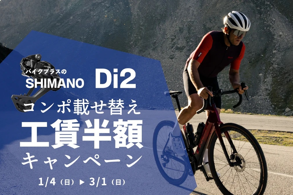バイクプラスがロードバイク電動コンポ載せ替えキャンペーンを開催している。シマノ DI2やスラム AXSなど電動コンポ一式を購入すると交換工賃が半額になるお得なチャンスだ。以下、リリースより紹介しよう。