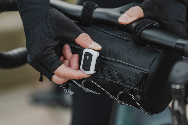 光源にはCOB(Chip on Board)ホワイトLEDを採用し、30ルーメンの明るさを実現している。高輝度点灯モードで約6時間、パルス点灯モードなら約20時間の連続使用が可能だ。補助灯や被視認性を高めるためのライトとしては十分な性能を持つ。特にフロントバッグに装着すれば、バッグ自体の視認性を高めつつ、手元を照らす用途にも使える。充電にはUSB-Cポートを採用しており、充電時間は約2時間。IPX6の防水性能も備えているため、雨天時の使用にも対応できる。