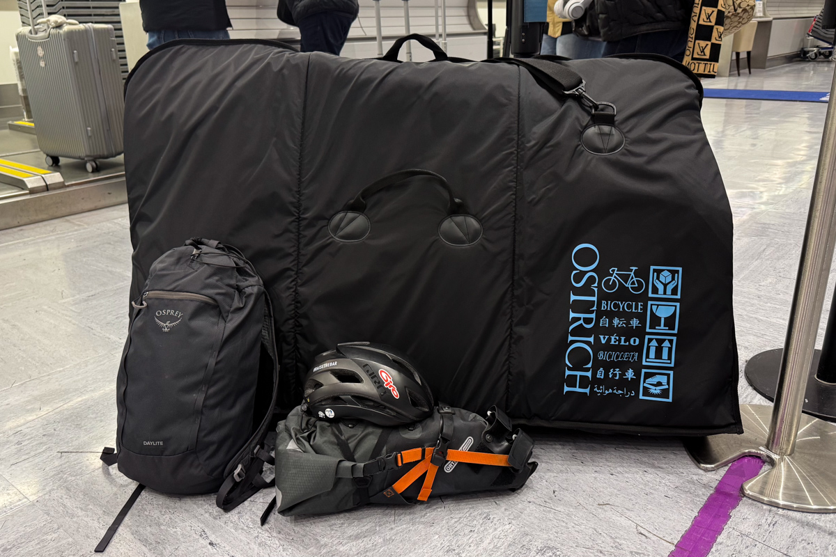 年の暮れ、予約していたフライトに間に合わせるべく仕事を片付け、空港へと向かった。旅先で年越しする長旅の予定だが、輪行バッグにサドルバッグ+デイパックというミニマムな荷物に絞った軽装で旅立った。なお輪行バッグはかさばるグラベルバイクが余裕で入るオーストリッチの新作OS-500W(ワイド)で、フレアや一体型ハンドルでもそのまま入るようサイドにマチがついている。