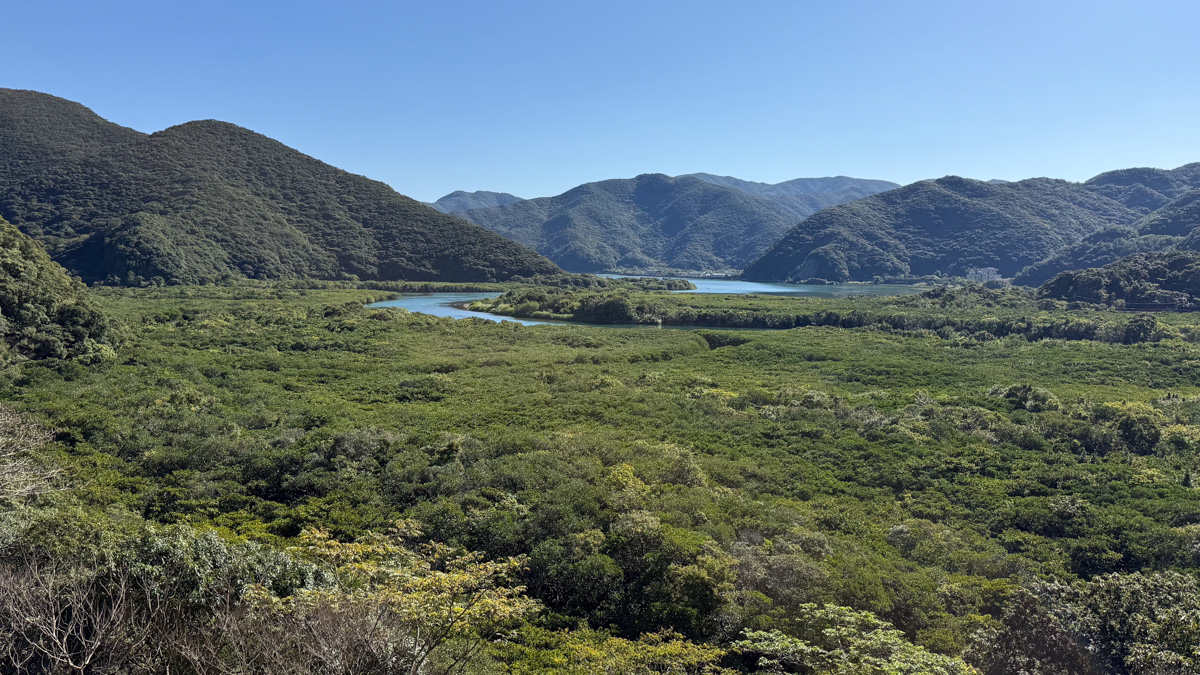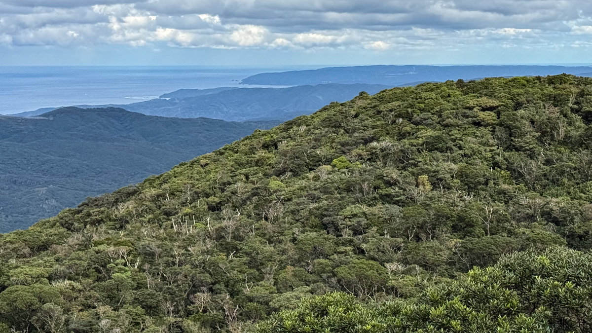 樹齢100年以上の照葉樹林や雲霧帯が広がり、奄美の山々が一望のもとに展開する。どの方向も海まで見渡せ、奄美大島の全貌がほぼ把握できた。ドローンの空撮のような映像が肉眼で楽しめるのだ。
