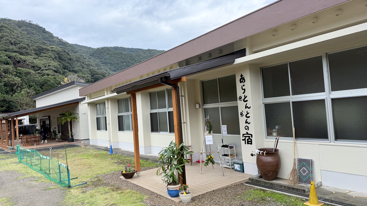かつて製糖工場で栄えた久慈(くじ)の集落に、新しい商店ができたという話を頼りにしていた。着いてみると、廃校になった久慈小中学校の校庭の奥に、それらしき店舗がある。しかし晦日のため閉まっていた(当然か)。そして廃校になった建物はリフォームされて「あらとんとんの宿」という宿泊施設になっており、脇には食事処もあった。