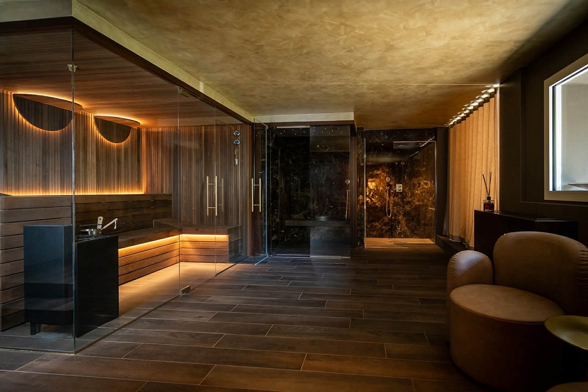 新設のAqua Wellnessスパ サウナとシャワールーム(水着着用) ©Hotel DORY