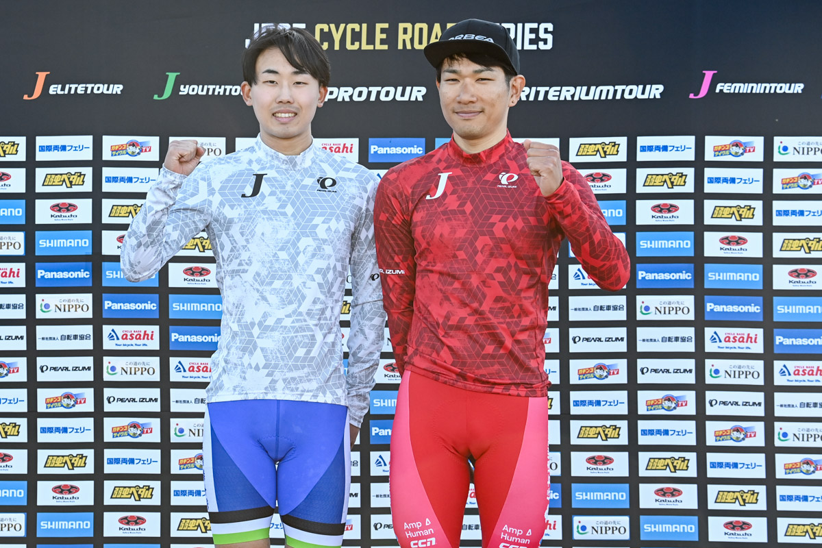 プロリーダージャージの草場啓吾(キナンレーシングチーム、右)と、昨年に続き開幕戦でU23リーダーとなった渡辺一気(京都産業大学) photo:Satoru Kato