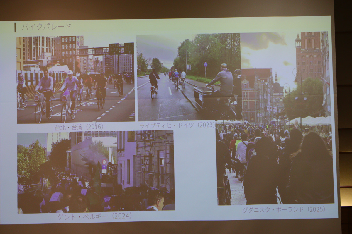 東海大学准教授の鈴木美緒氏による「Velo-city の概要と世界的意義」と題する講演では、Velo-cityの概要や過去の開催国における例、特徴など実際的な話を絡めながら、日本での開催意義が説明された。