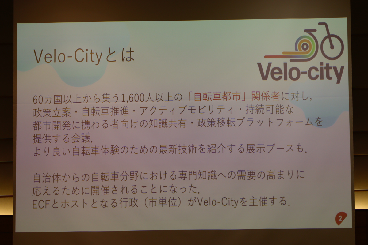 Velo-cityは1980年の初開催以来、毎年1回、欧州を中心に世界各地で開催されており、2027年5月には日本で初めて、またアジアでは台北に次いで2回目となる会議が愛媛県で開催されることが決まっている。(開催決定時の記事)
