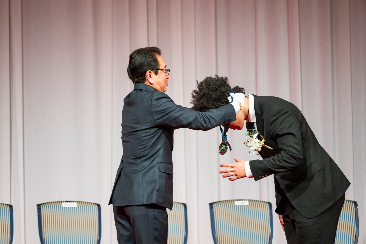 木戸会長から記念のブレザーを着せてもらう郡司浩平(神奈川) photo: Yuichiro Hosoda