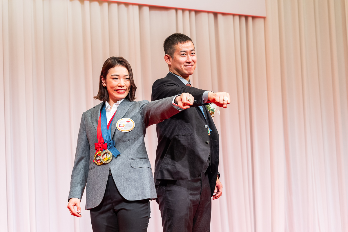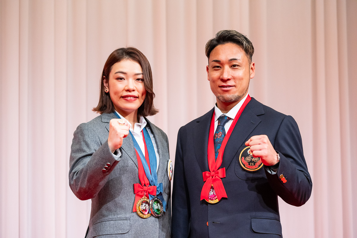 グランドスラム賞とグランプリスラム賞を同時受賞した佐藤水菜(神奈川)と脇本雄太(福井)が記念のリングを見せる photo: Yuichiro Hosoda