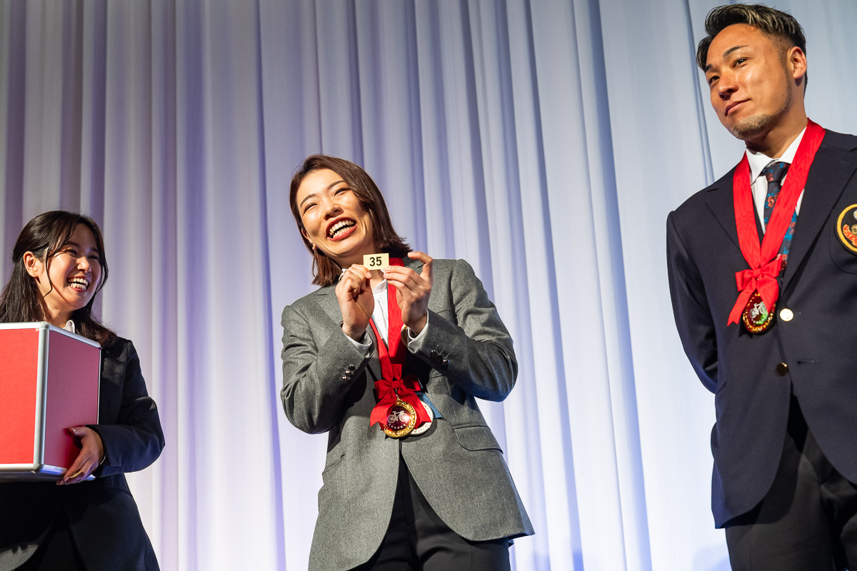 トーク後に行われた2人のサイン入り写真パネルが当たる抽選会では、自分の番号を言って「当てて〜」とリクエストするファンも。最後に選手達が再び壇上に並んで挨拶をし、祝賀会は終了。来場者の皆さんは出口で記念品を受け取り、満足げな表情で会場を後にした。今年も選手達の実績を讃えるとともに、今後の活躍への期待が高まる催しとなった。