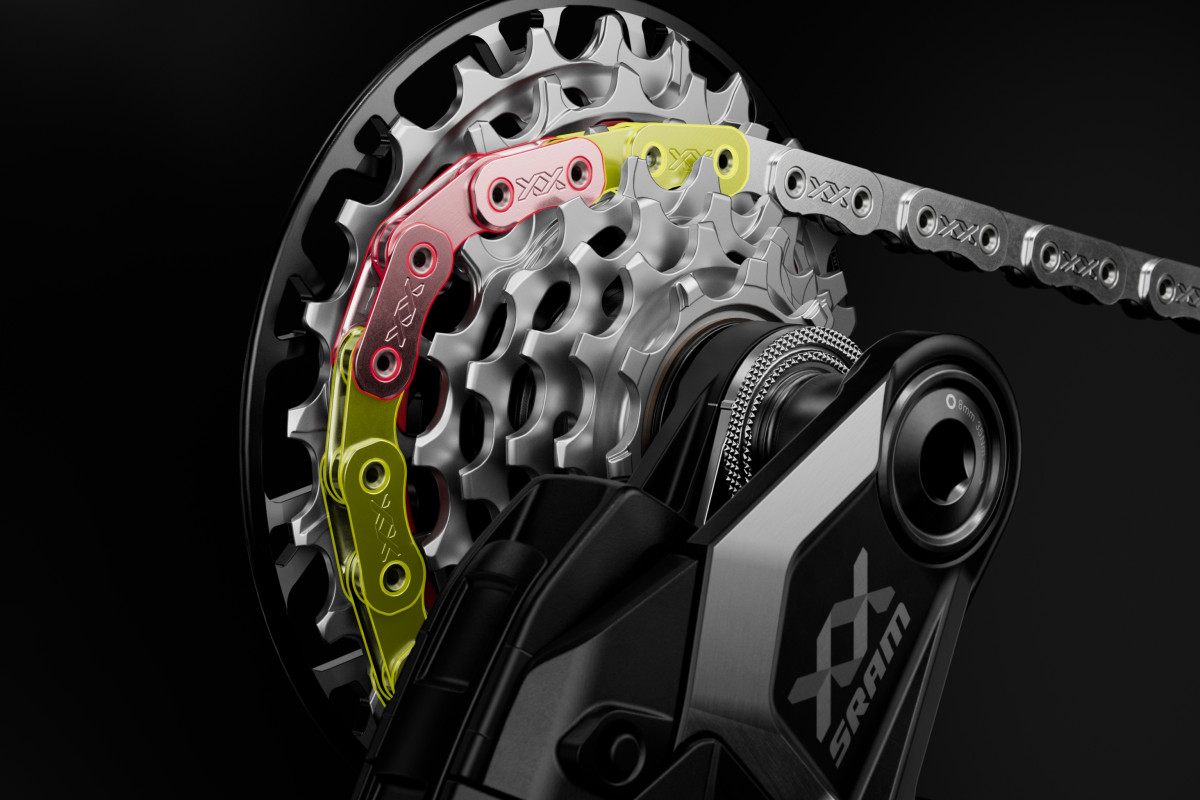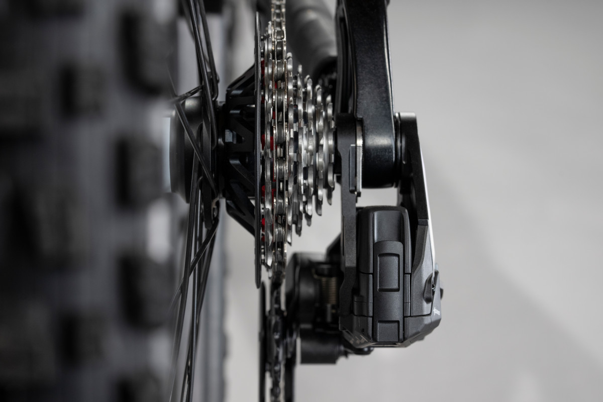 E-MTBをも凌駕する最大瞬間出力でのスプリントでは、従来のドライブトレインでは変速のたびに力を抜く必要があり、最大で半分の出力を失うケースもあったという。この問題を解決するために、スラムは全力で踏み込んでいても確実に変速が可能なドライブトレインを開発した。