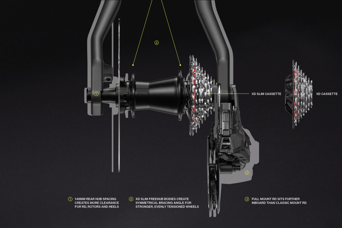 ダウンヒルバイクの多くが採用する148mmリアハブ規格に合わせたXD SLIMフリーボディは全長を短縮することで、ハブフランジの設計に余白をもたらし、左右対称なスポーク入射角を実現。優れた強度とバランスの取れたホイールビルドを可能とし、バイクシステム全体としての信頼性と競争力を底上げする。