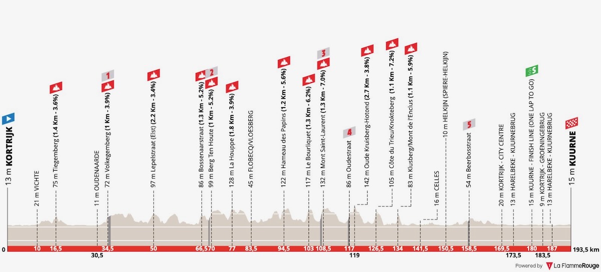 193.5kmのコースは11の丘と5つの石畳(うち3つは石畳坂)が登場する春のクラシックシーズン開幕戦。しかしオムロープより難易度は低く、また最後の丘からフィニッシュまでの59.5kmは平坦路のため、ピュアスプリンターが集結。レースはその通り、白熱のスプリントで決着した。