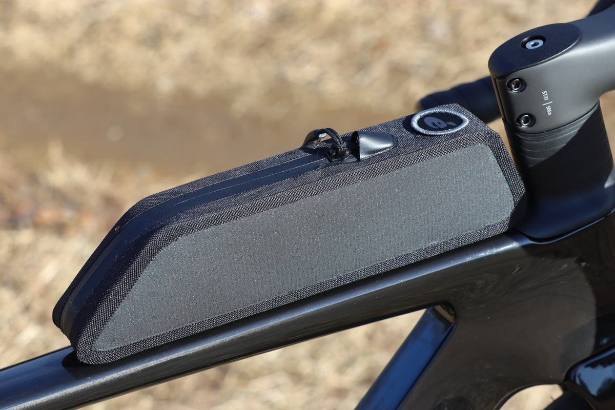 専用トップチューブバッグも付属する。見たところ前モデルから形状の変化がないバッグだが、フレーム装着側のアダプタープレート等がアップデートされ、底の隙間を無くし、揺れが少なくなる工夫がされている。ミニマルなデザインでエアロ効果も高い。